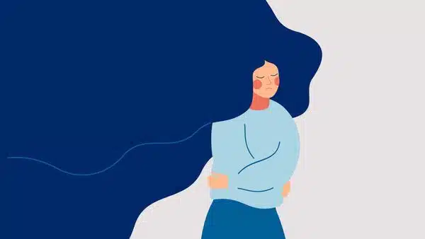 A sad woman with flowing hair runs away from the problems in her life. The depressed teenager withdrew into himself, hugging his elbows. Colorful vector illustration in flat cartoon style